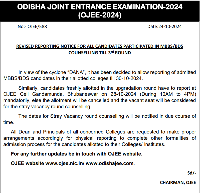 In view of the cyclone “DANA”, it has been decided to allow reporting of admitted MBBS/BDS candidates in their allotted colleges till 30-10-2024, the OJEE authorities said in a fresh notification.