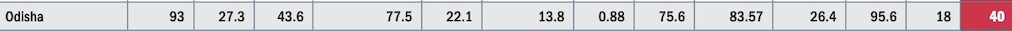 With a score of 39, Odisha has finished last in ‘Goal of Gender Equality’ category. It has the lowest female-to-male wage ratio at 0.59.