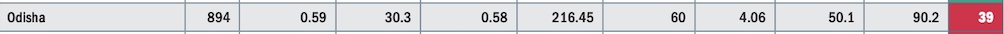 However, Odisha continues in the aspirant category in ‘Zero Hunger’ with a low score of 45. The percentage of pregnant women between 15 and 49 years of age who are anaemic has increased to 61.8% from 47.6% in the previous index. Similarly, the percentage of stunted children under five years has gone up from 29.1%t to 31%. Children who are underweight have increased from 29.2% to 29.7%.