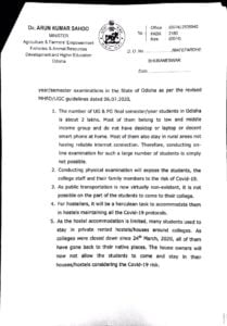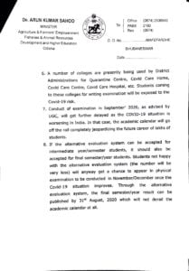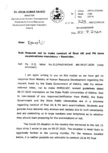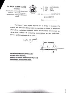 Bhubaneswar: Odisha Higher Education Minister Dr Arun Kumar Sahoo once again requested the Union HRD Minister Ramesh Pokhriyal Nishank to not make the final year examinations of UG and PG terms 2020 mandatory.