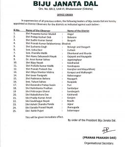 The order signed by organisational secretary Pranab Prakash Das said in supersession of all previous orders, the leaders have been appointed as district observers on the order of party president and Chief Minister Naveen Patnaik. The order will come into immediate effect, it added.