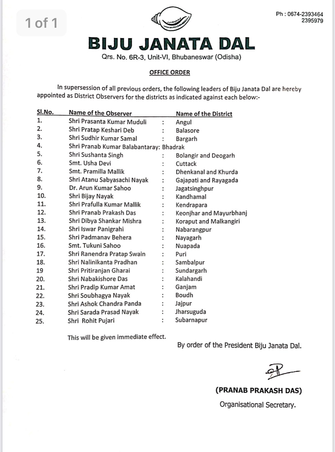 Apart from Pritiranjan Gharai, who has been assigned Sundargarh, BJD leaders from western Odisha have been appointed observers for Balangir and Deogarh (Sushanta Singh), Kalahandi (Nabakishore Das), Jharsuguda (Sarada Prasad Nayak) and Sonepur (Rohit Pujari). Soubhagya Nayak will continue to be in charge of Boudh.