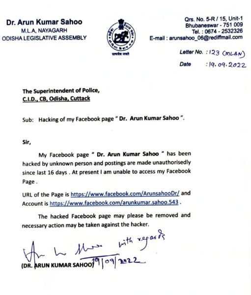 “My Facebook page ‘Dr. Arun Kumar Sahoo’ has been hacked by an unknown person and postings are made unauthorisedly since last 16 days. At present, I am unable to access my Facebook page,” Sahoo said in his complaint.