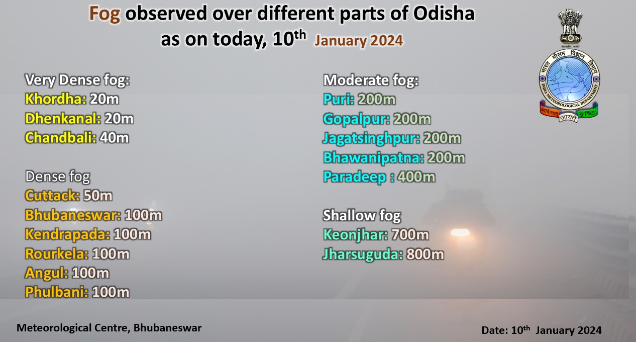 Notably, the MeT office had issued yellow warning of dense fog for one or two places in Jharsuguda, Sundargarh, Keonjhar, Deogarh, Angul, Dhenkanal, Jajpur, Bhadrak, Cuttack, Kendrapada, Jagatsinghpur, Puri, Khurda, Nayagarh, Gajapati, Ganjam, Kandhamal, Kalahandi, Rayagada, Koraput, Nawarangpur, Balangir.