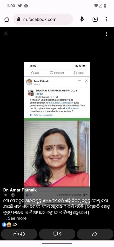 The BJD MP said that his FB account was hacked after the post seeking opinion on the prospects Mission Shakti secretary Sujata R Karthikeyan quitting service to contest elections fuelled political speculation.