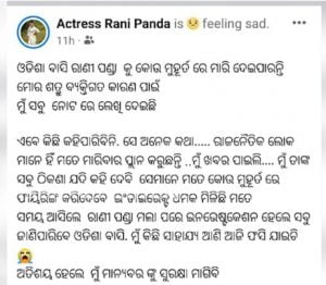 Bhubaneswar: Opera artist Rani Panda has landed herself with another controversy with a social media post stating that some political leaders were trying to shoot her dead.