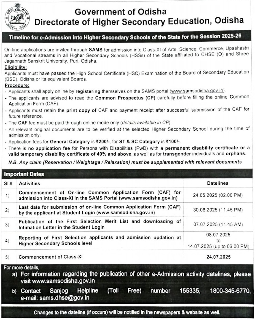 Bhubaneswar: The Odisha government has announced the admission schedule for Plus II courses in all higher secondary schools for the 2025-26 academic session.