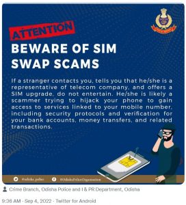Bhubaneswar: After issuing advisory to people on fake app loans and online part-time job offers by cyber criminals, Odisha Police has alerted about SIM swap scams.