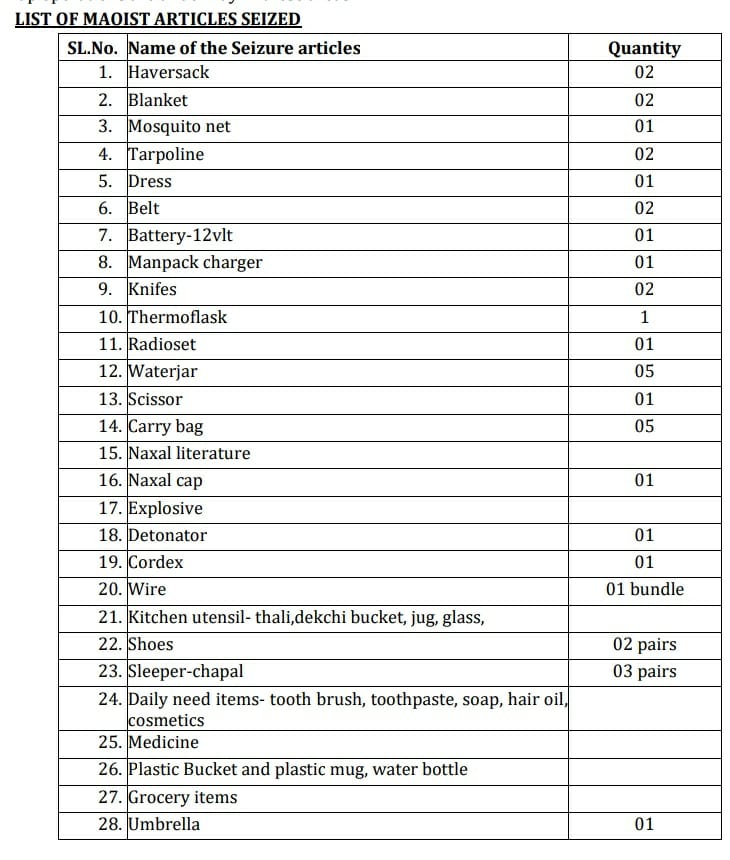 After the exchange of fire, that area was thoroughly searched and a large quantity of Maoists articles was recovered. Subsequent follow up operations are underway in these areas.