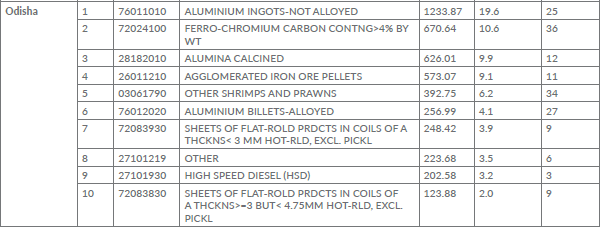 The state also topped in exporting items like Aluminium Ingots, followed by Ferro-Chromium Carbon Counting, Alumina Calcined, Iron-ore pellets and other shrimps and prawns.