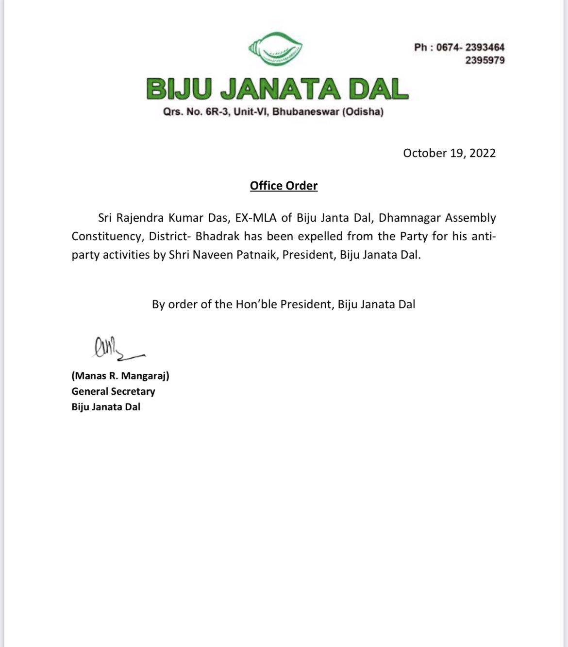 Bhubaneswar: The BJD on Wednesday expelled former MLA Rajendra Das, who is contesting the Dhamnagar bypoll as a rebel candidate, from the party for anti-party activities.