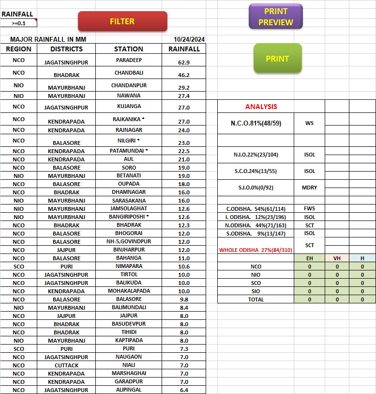 Scattered heavy to very heavy rainfall (7 to 20cm) with isolated extremely heavy rainfall (>20cm) falls may occur in Jagatsinghpur, Kendrapada, Cuttack, Bhadrak, Jajpur, Balasore, and Mayurbhanj districts.