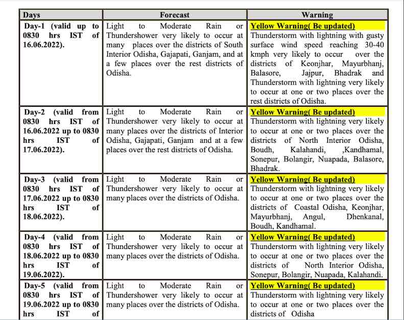 While several places in Odisha are likely to experience light to moderate rain during the next few days, the IMD has also issued yellow warning for thunderstorm with lightning till 8.30 am on June 19.