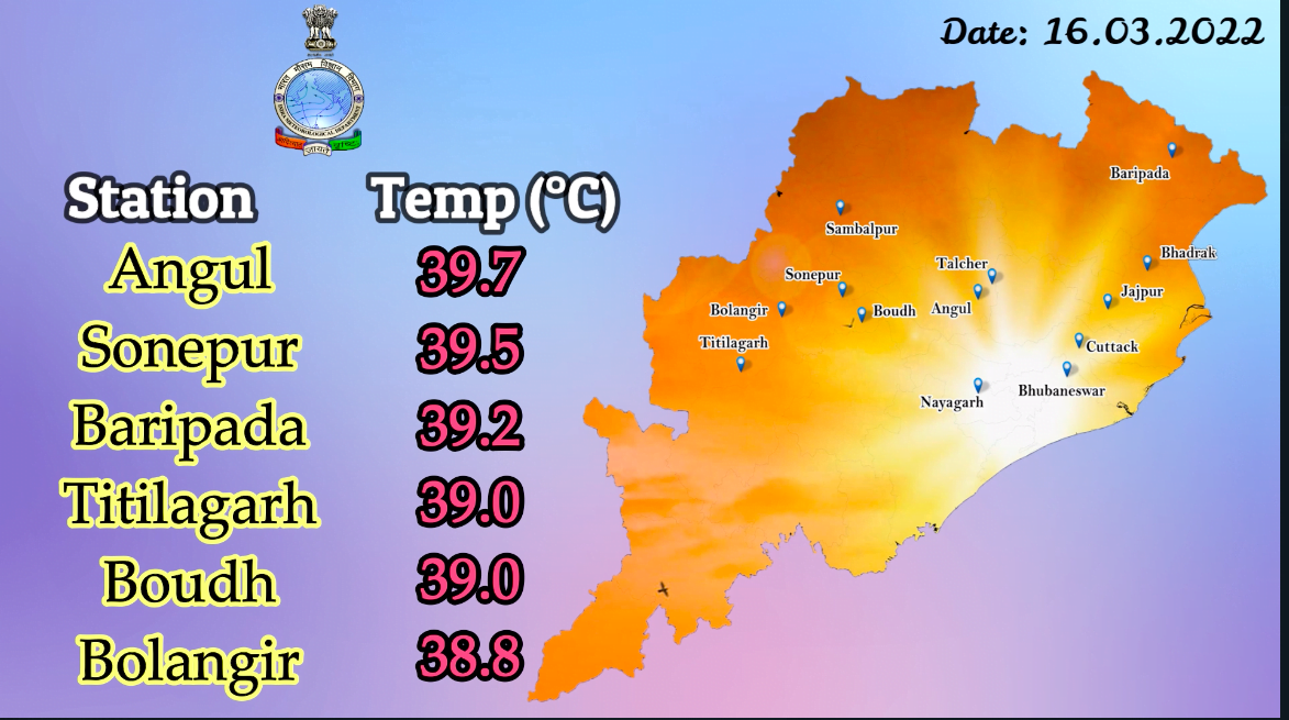 Bhubaneswar: Angul was the hottest place in Odisha at 39.7 degree Celsius in the last 24 hours, the Bhubaneswar Meteorological Department informed on Wednesday.