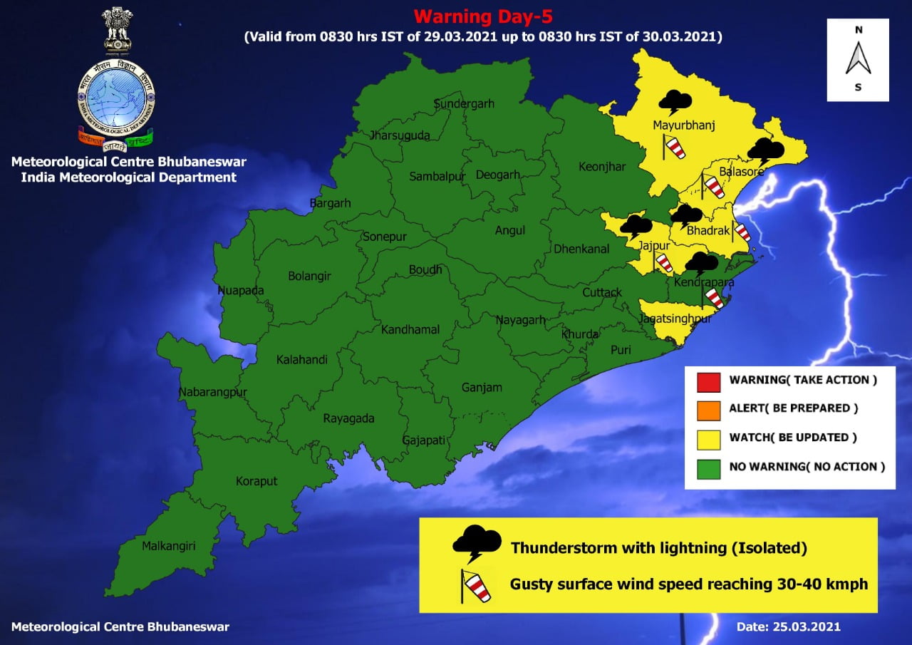 Thunderstorm and lightning with gusty surface wind speed reaching 30-40 kmph likely at one or two places in Mayurbhanj, Balasore, Bhadrak, Jajpur and Kendrapada.