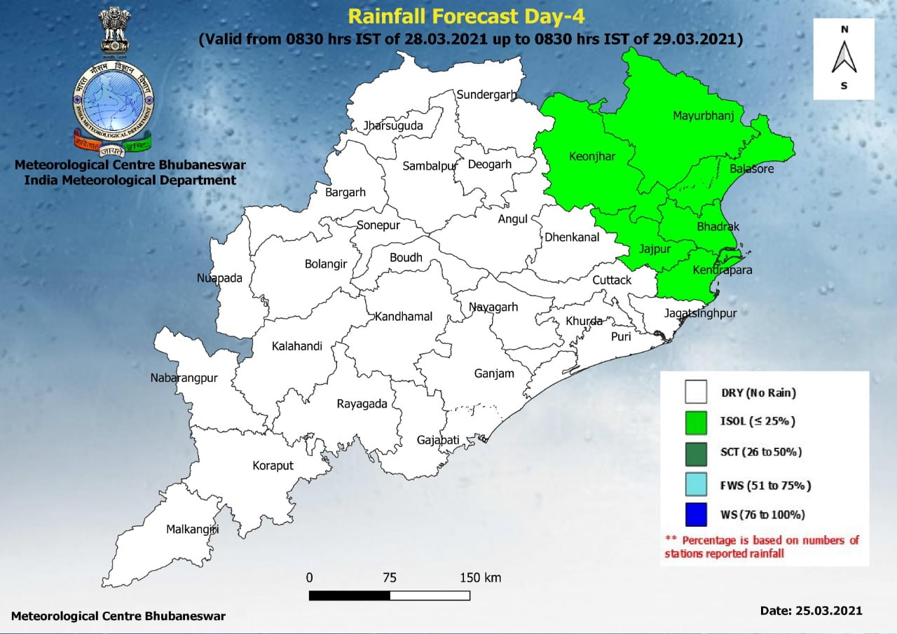 Light to moderate rain or thundershower is also likely at one or two places in Keonjhar, Mayurbhanj, Balasore, Bhadrak, Jajpur and Kendrapada.