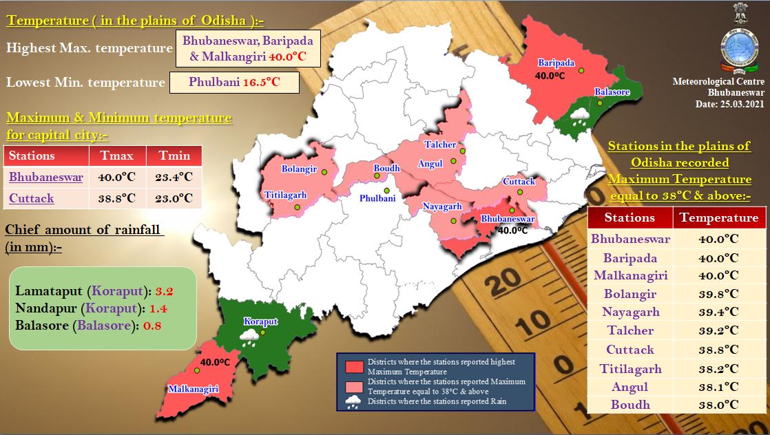 On Wednesday, Bhubaneswar, Malkangiri and Baripada were the hottest at 40 degree Celsius. Mercury soared bove 38 degree Celsius at seven other places in the state.