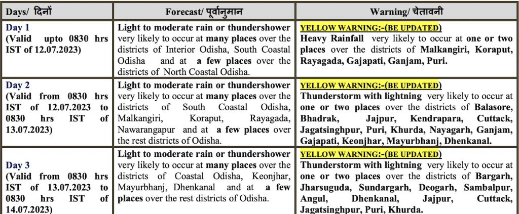 Bhubaneswar: Even as coastal districts of Odisha experience incessant rains on Tuesday morning, the India Meteorological Department (IMD) has forecast heavy downpour at one or two places in Malkangiri, Koraput, Rayagada, Gajapati, Ganjam, Puri till Wednesday morning.