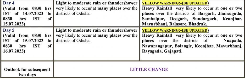While there is warning for thunderstorm with lighting for several places with light to moderate rain across the state for next two days, heavy rain will lash South and North districts again from July 14 with little change in the forecast for subsequent two days, according to the midday bulletin.