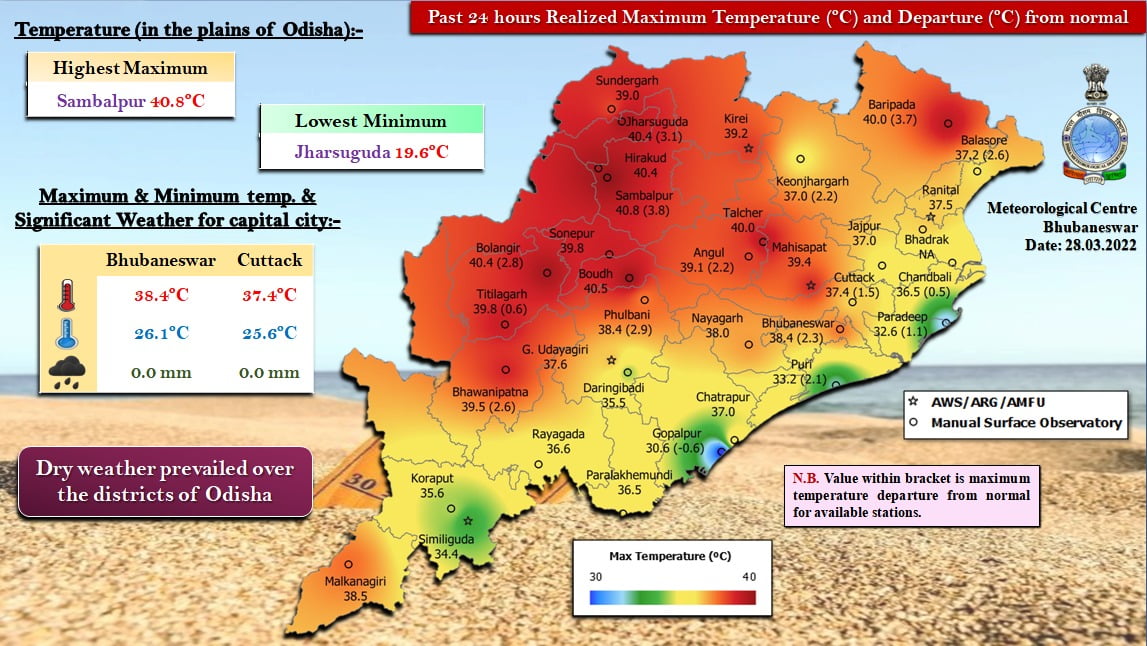 In the last 24 hours, the highest maximum temperature of 40.8 degree Celsius was recorded at Sambalpur. Balangir, Jharsuguda and Hirakud recorded 40.4 degree each.While Baripada and Talcher registered 40 degree Celsius, it was 40.5 degree in Boudh.