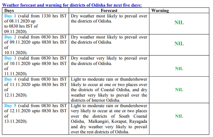 Bhubaneswar: The Meteorological Centre here has forecast light to moderate rain or thundershower in coastal Odisha and south coastal districts of Malkangiri, Koraput and Rayagada between November 11 and November 13.