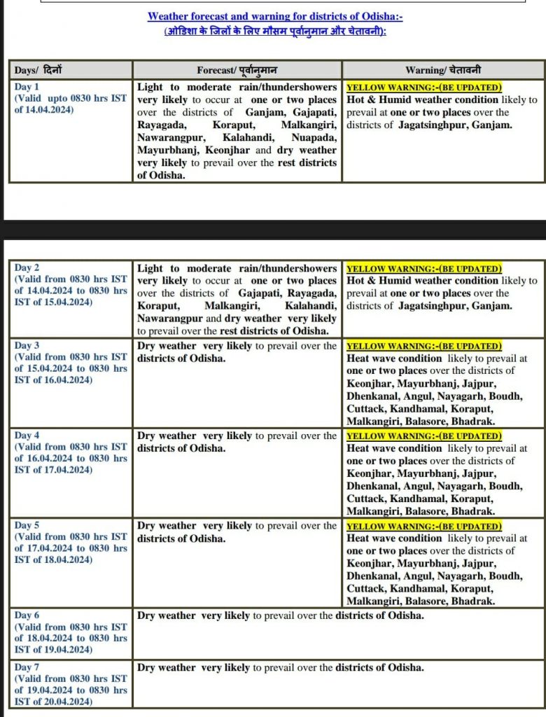 The Meteorological Centre in Bhubaneswar said that heatwave conditions are likely to prevail at some places in the state during the three days thereafter. The MeT Centre also issued a yellow warning for the next five days.