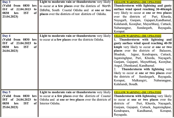 On April 22-23, several districts in the state are likely to experience thunderstorm with lightning and gusty surface wind speed reaching 30-40kmph with more widespread rain, which may lead to a gradual fall in the day temperature by 2 to 4 degree Celsius, the MeT office said.