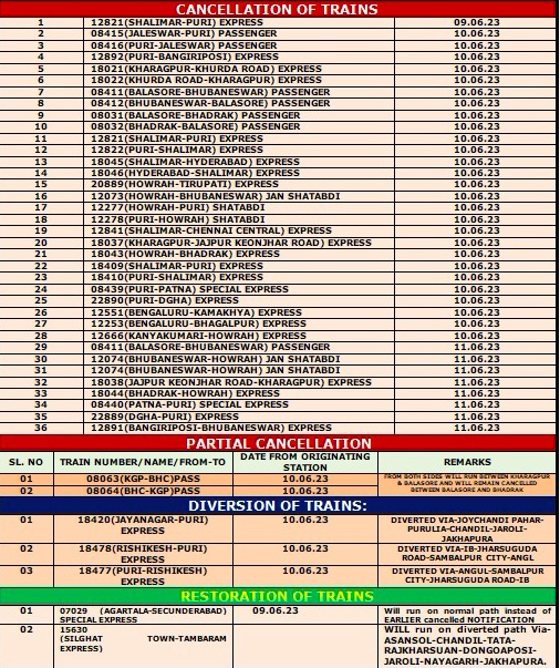 Bhubaneswar: In the aftermath of the horrific train accident at Bahanaga Bazar station in Odisha’s Balasore districts, the East Coast Railway has cancelled 35 trains, which were scheduled to run on June 10 and June 11. Two trains have been partially cancelled and three have been diverted while services of one has been restored.