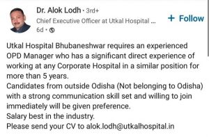 Bhubaneswar: Utkal Hospital CEO Alok Lodh was on Sunday suspended by the hospital management over a recruitment ad that sought “applications only from non-Odias”.