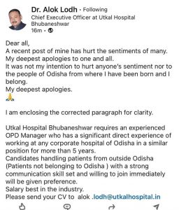 “It has come to the notice of Utkal Hospital management that Dr Alok Lodh, CEO, has posted some statements in his personal social media account without any authorisation from management, which has hurt the sentiments of Odias. Such act of Dr Alok Lodh is purely his personal and Utkal Hospital Management does not endorse such action,” the management said in a statement.