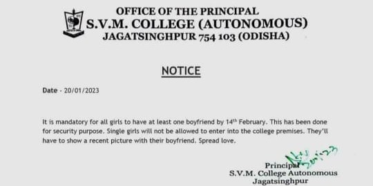 “It is mandatory for all girls to have at least one boyfriend by February 14. This has been done for security purpose. Single girls will not be allowed to enter the college premises. They will have to show a recent picture with their boyfriend,” read the notice.