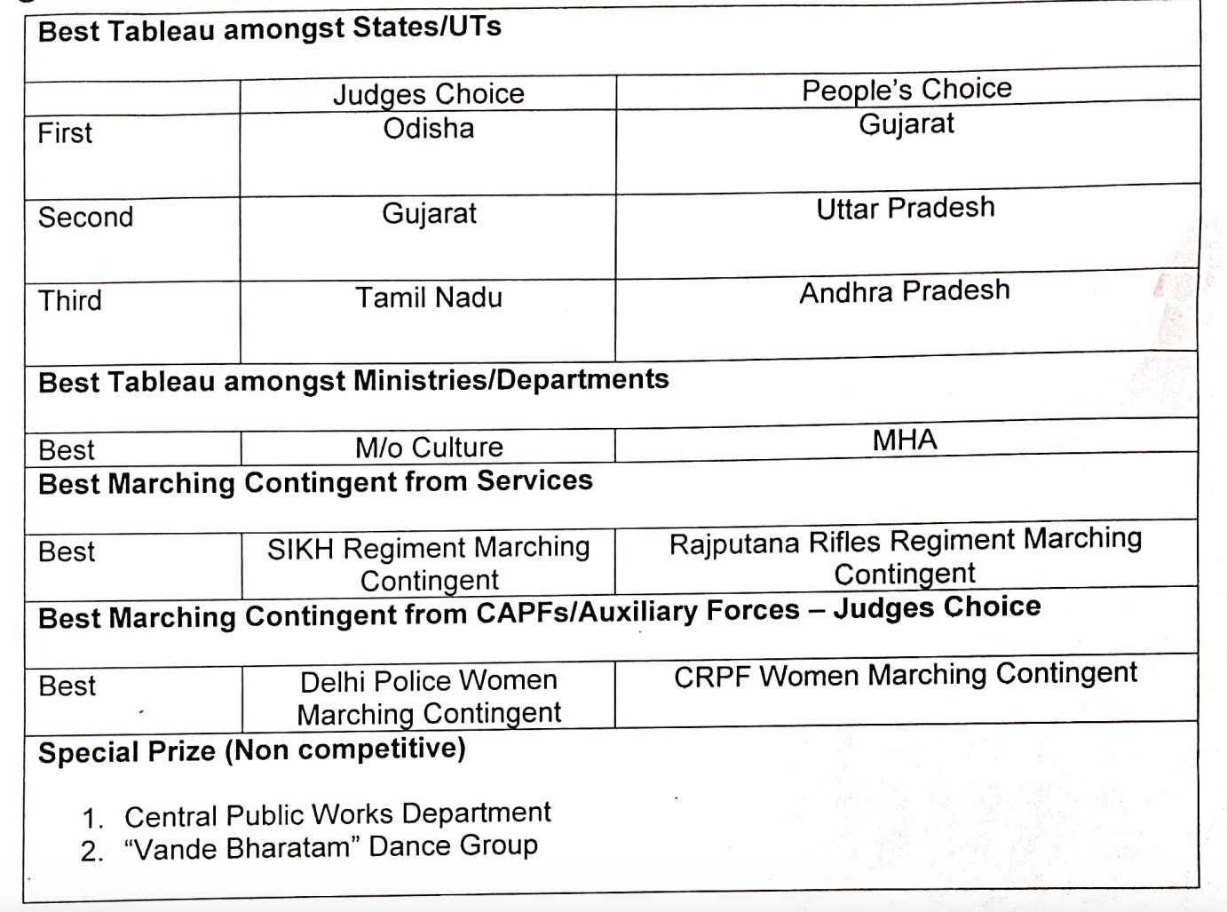 The tableaus from Gujarat and Tamil Nadu have been adjudged second and third respectively. Sixteen states and Union territories had presented their tableaus at the parade.