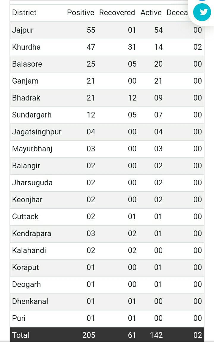 Bhubaneswar: Wednesday saw the highest spike in coronavirus patients in Odisha with 28 persons, 17 alone from Ganjam, testing positive for the virus, taking the affected tally to 205.