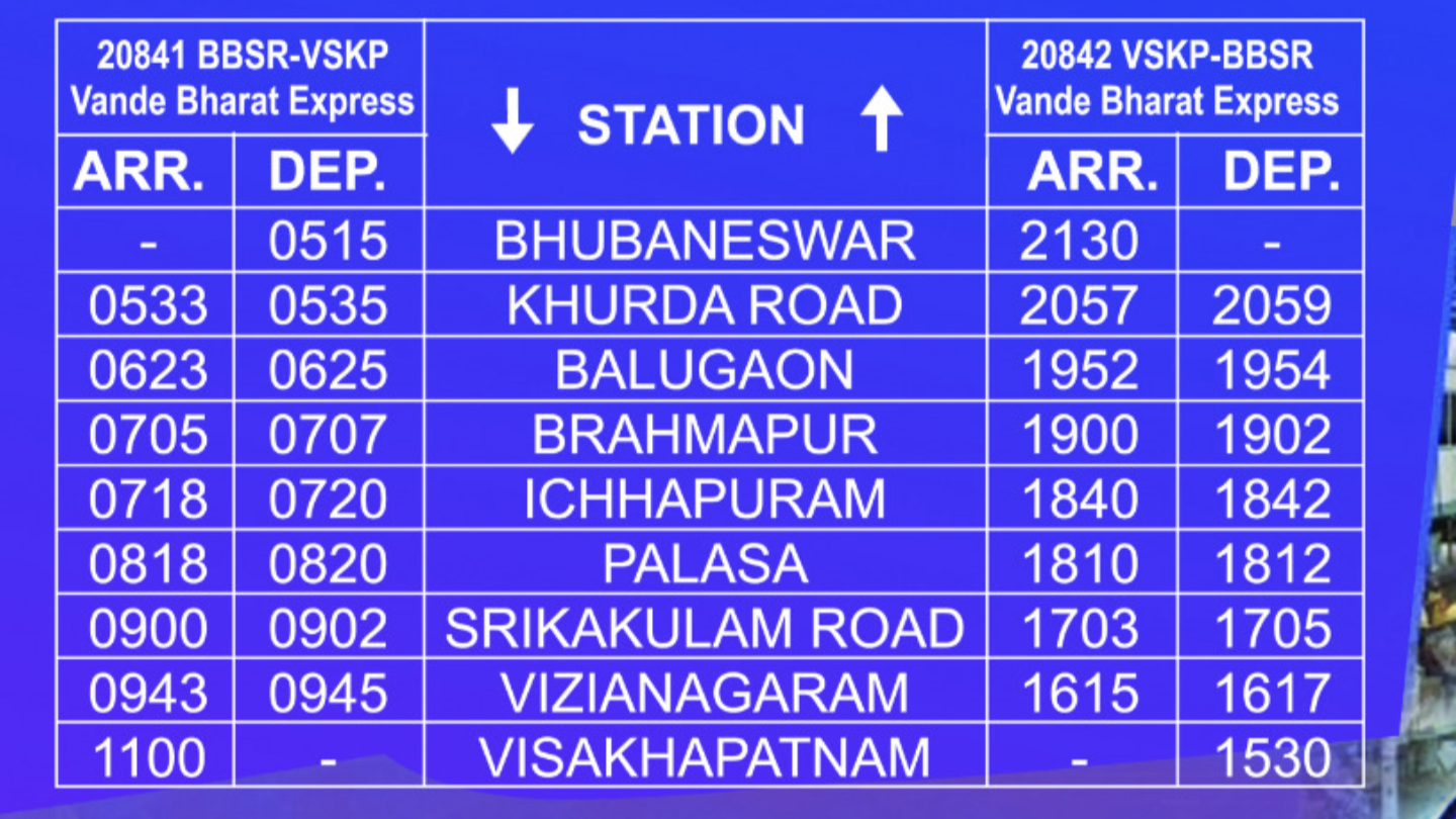The train in a unique grey-saffron colour will run six days a week except on Monday. It will leave Bhubaneswar at 5.15 am while the departure time from Visakhapatnam is 3.30 pm. It will have stoppages at Khurda Road, Balugaon, Berhampur, Ichhapuram, Srikakulam Road, Vizianagaram between Bhubaneswar and Visakhapatnam.