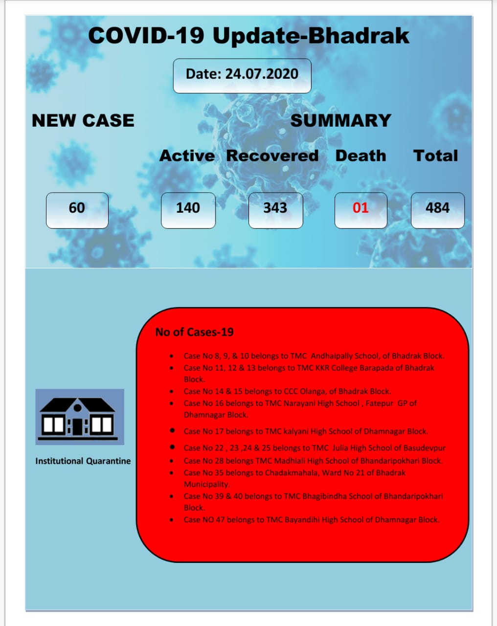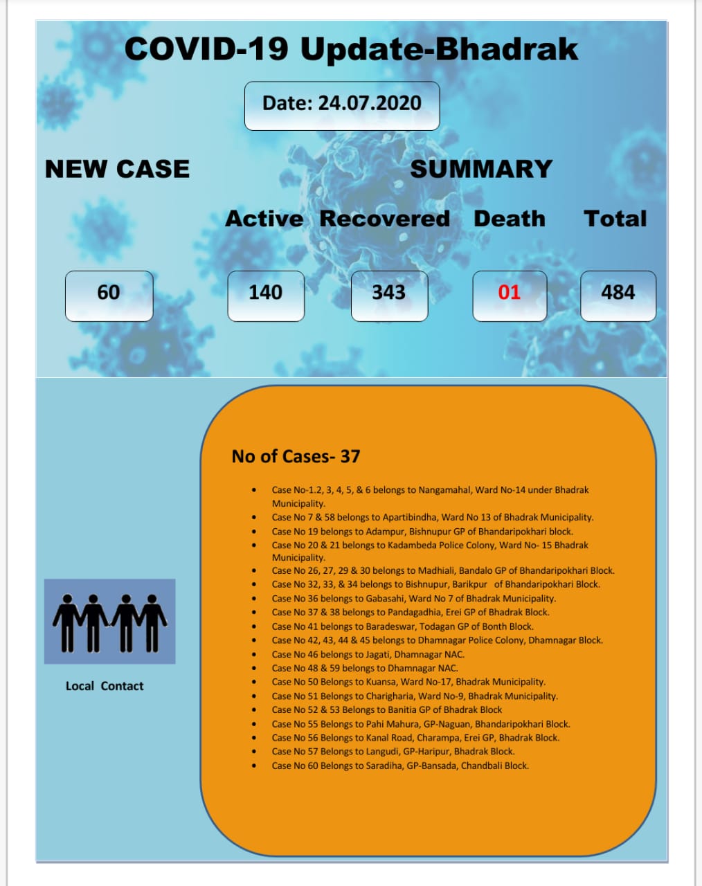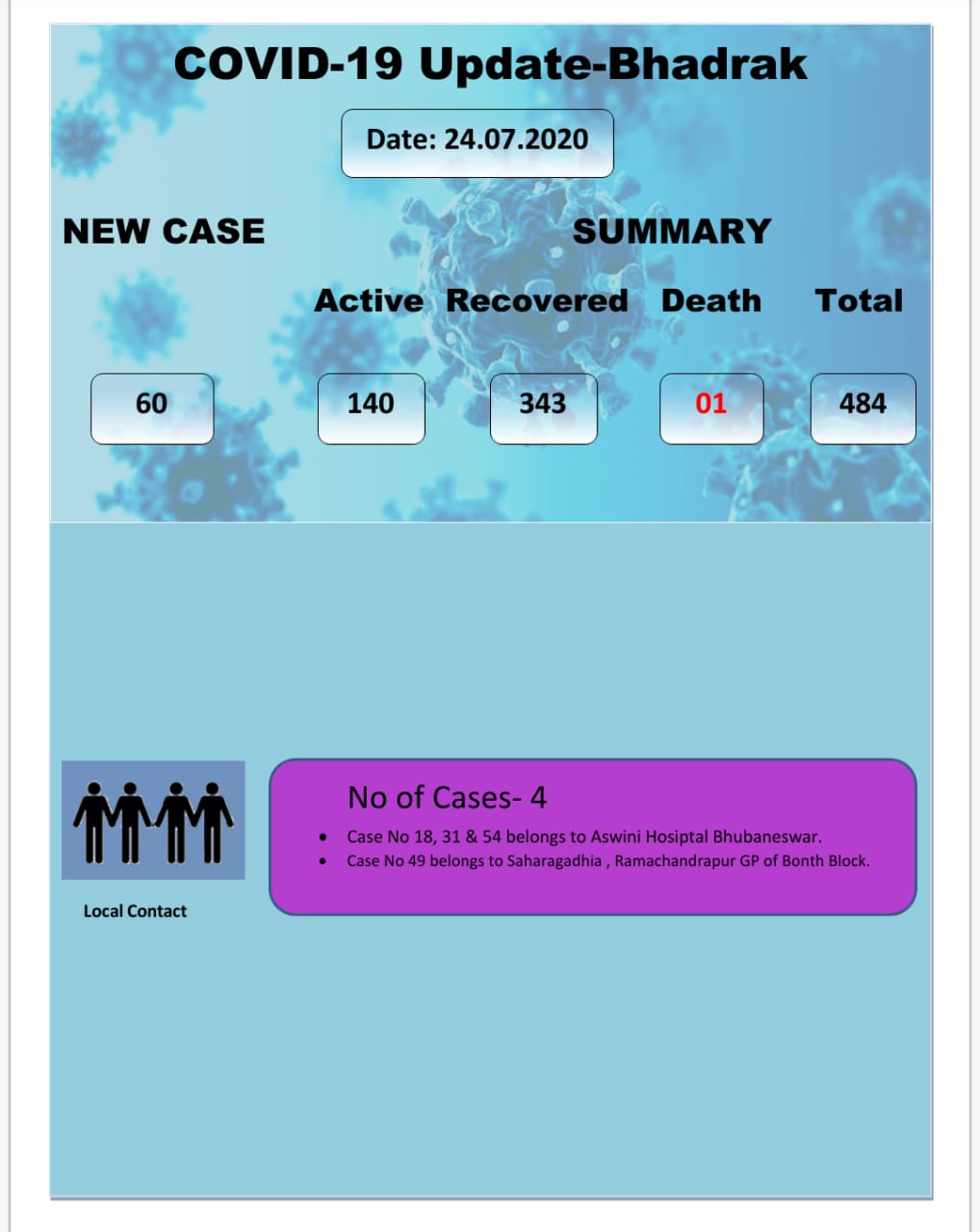 Bhadrak Collector Gyana Ranjan Das informed that of the new positive cases, 41 were local contacts and 19 were reported from institutional quarantine centres.