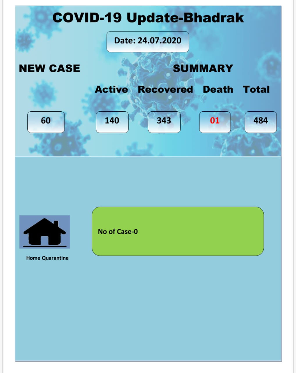 Bhadrak: The COVID-19 positive cases in Bhadrak district went up to 484 on Friday with the highest single-day spike of 60 cases in the last 24 hours.