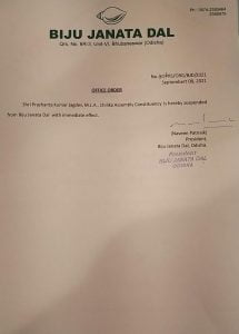 Chief minister and BJD president Naveen Patnaik in an official order said Prashant Kumar Jagdev, MLA of Chilika Assembly constituency in Khurda district is suspended from Biju Janata Dal (BJD) with immediate effect. The chief minister has also removed Jagdev from the post of chairperson, District Planning Committee, Khurda.