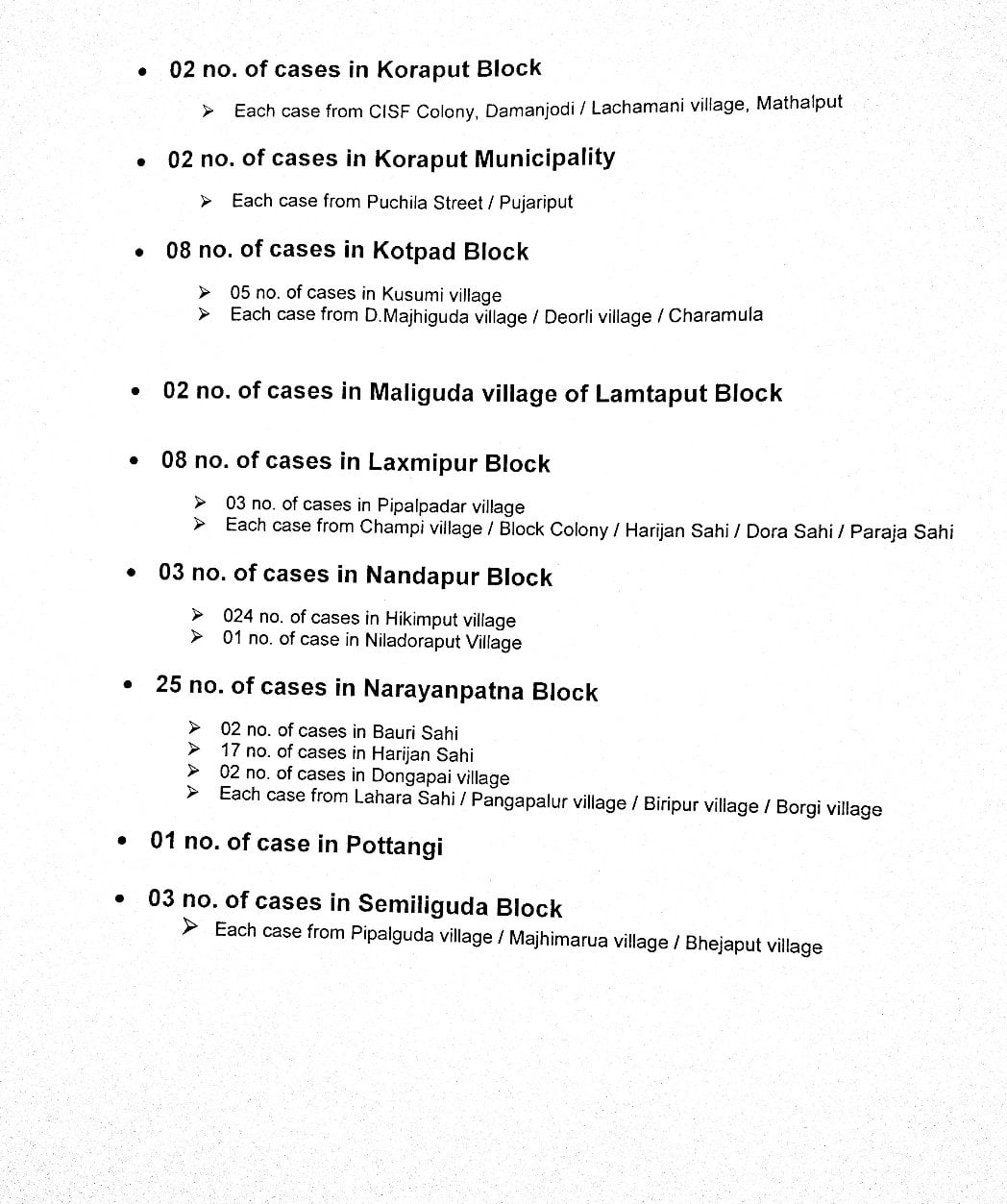 The highest of 26 cases have been reported from Jeypore municipality, 25 from Narayanpatna block, eight each from Laxmipur and Kotpad, five each from Jeypore and Bandhugaon, three from Semiliguda, two each from Koraput block and Municipality and one from Pottangi.