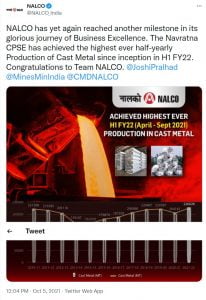 Union Coal and Mines Minister Pralhad Joshi in a tweet on Tuesday congratulated the company on the achievement. “NALCO has yet again reached another milestone in its glorious journey of Business Excellence. The Navratna CPSE has achieved the highest ever half-yearly Production of Cast Metal since inception in H1 FY22,” he said.