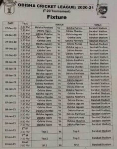 Cuttack: The Odisha Cricket Association (OCA) on Saturday announced the schedule for the T-20 League tournament scheduled to begin at Barabati Stadium from Sunday (December 27).