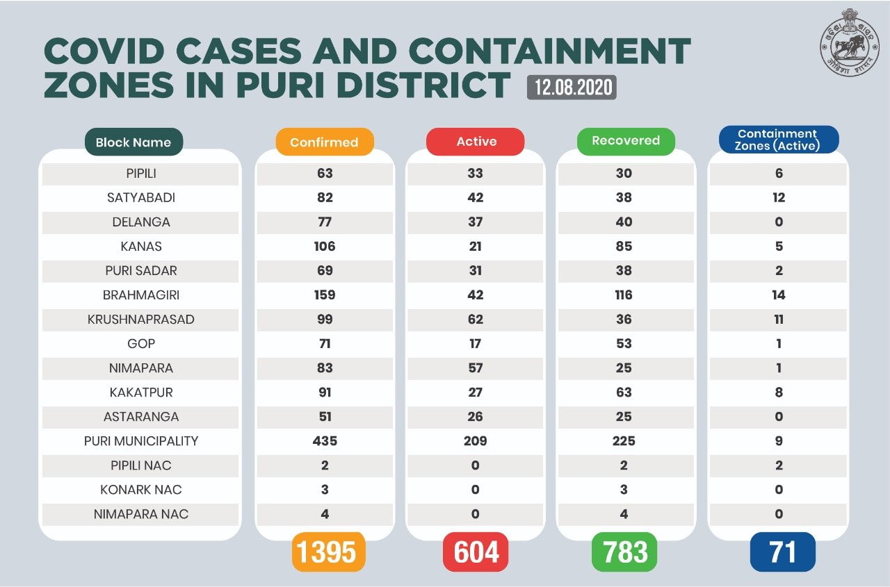 The highest of 435 positive cases have been reported from Puri Municipality followed by 159 in Brahmagiri and 106 from Kanas.
