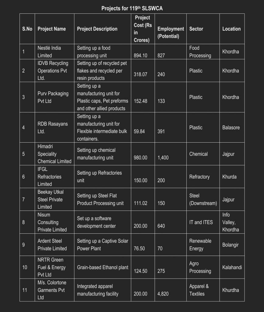 These projects, which would be set up in Balasore, Balangir, Kalahandi, Khurda and Jajpur districts, are expected to generate 9,146 employment opportunities.