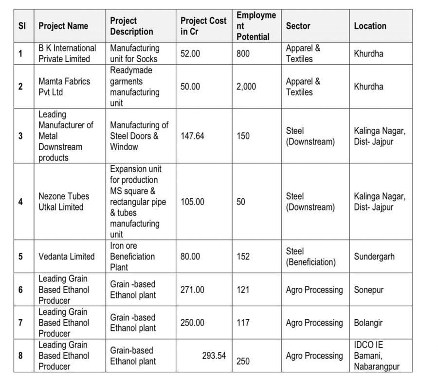 • BK International Private Limited to establish a manufacturing unit for socks with an investment of Rs 52 crore in Khurda.