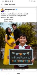 Akash revealed the information in his Facebook post with his first son holding a placard that read, “I’m being promoted! Big Brother”.