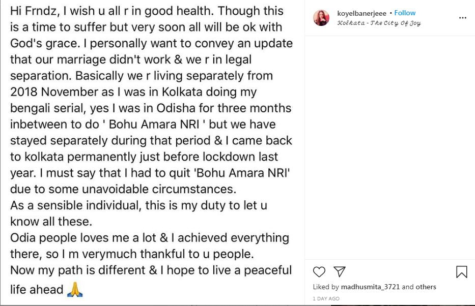 Koyel posted an update on Instagram, saying that they have not been staying together since November 2018. They had got married in 2013.