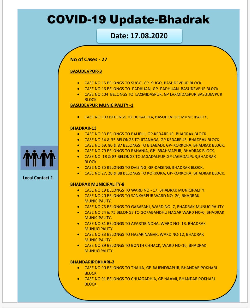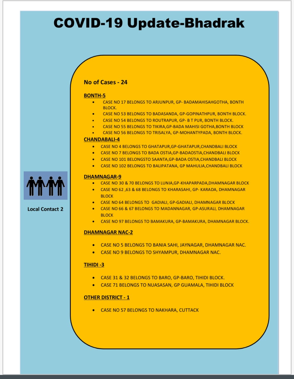 The highest of 22 cases each were reported from Dhamnagar and Bhadrak blocks, followed by 20 from Bhadrak municipality, 14 from Bonth, 12 from Dhamnagar NAC, four from Chandbali, three each from Tihidi and Basudevpur, two from Bhandaripokhari and one is a Basudevpur municipality and another is a returnee of Cuttack district.