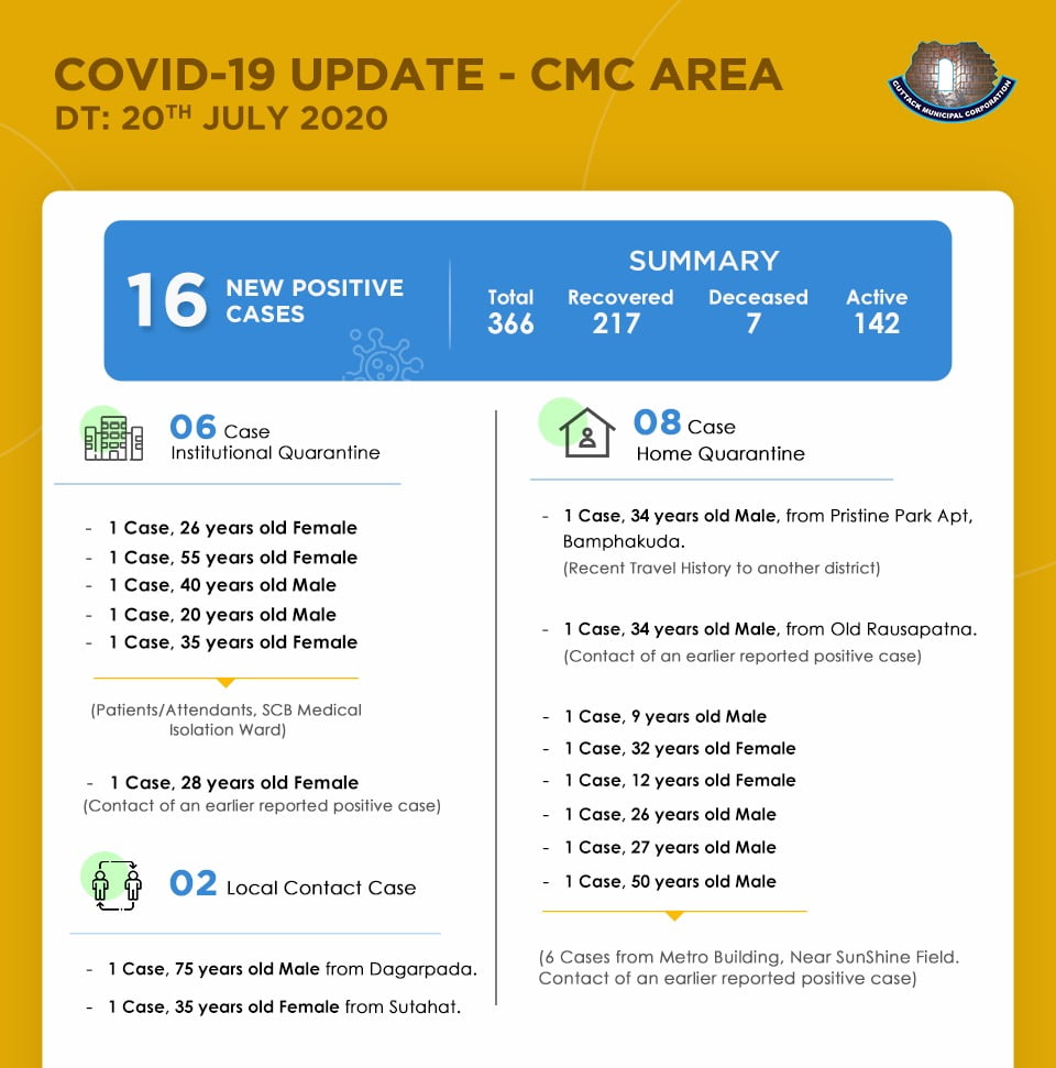 Cuttack: The COVID-19 tally in Cuttack city rose to 366 on Monday with 16 more persons testing positive for the virus in the last 24 hours.