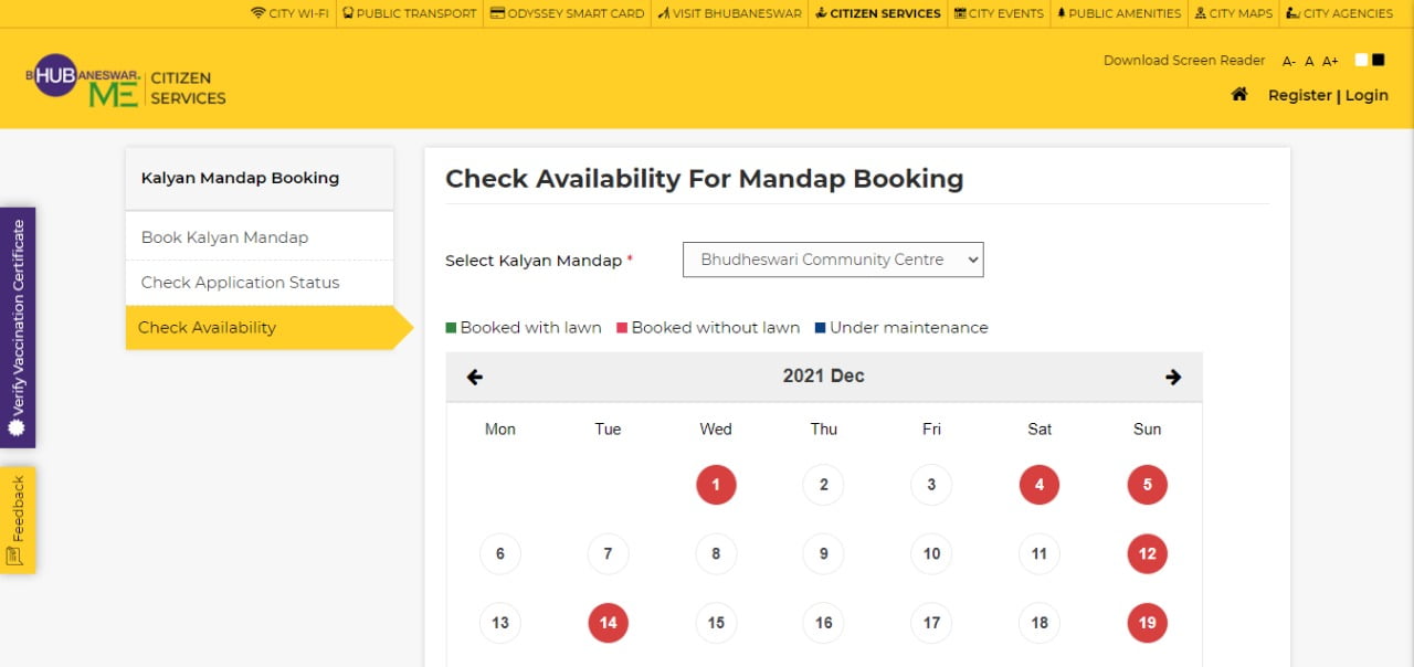 Denizens can check real-time availability of kalyan mandaps for the selected date range from the particular section under Bhubaneswar.Me portal and book the venue by paying booking fees through the multiple online payment options such as UPI, credit card and debit card, a BMC release said.