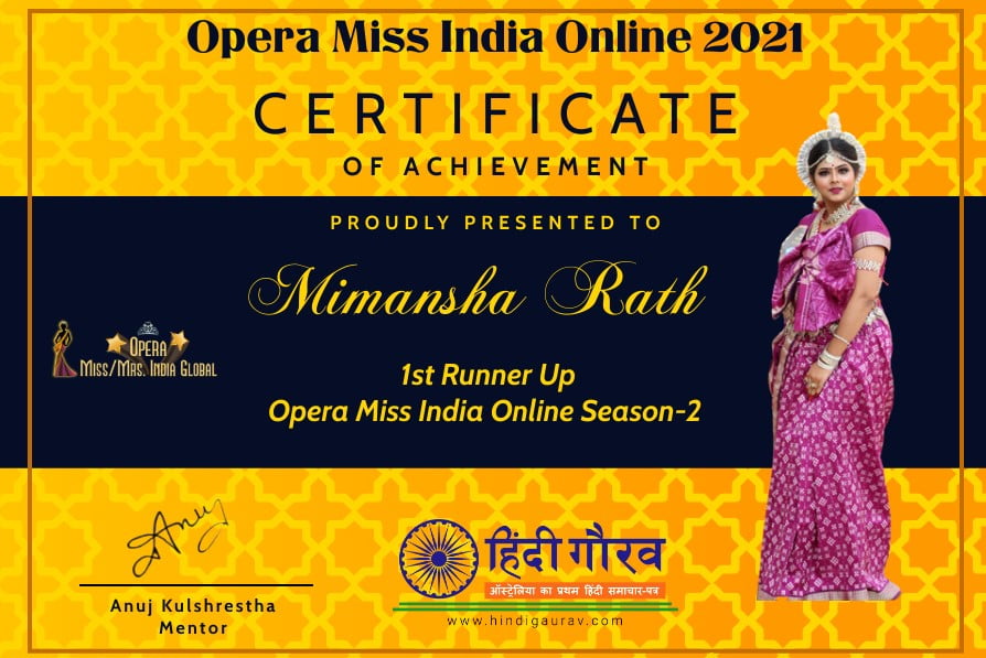 Bhubaneswar: Mimansha Priyadarshini Rath from Odisha’s Sambalpur has won the Opera Miss India 1st runners up title.
