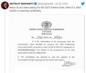 OPSC chairman Satyajit Mohanty posted the official notice for the examination in Twitter. “It is for information of all concerned that, the Commission have decided to conduct the OCS Preliminary Examination, 2021, pursuant to Advt. No.25 of 2021-22, tentatively on 16.10.2022 (Sunday),” read the notice.